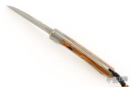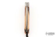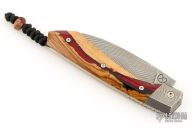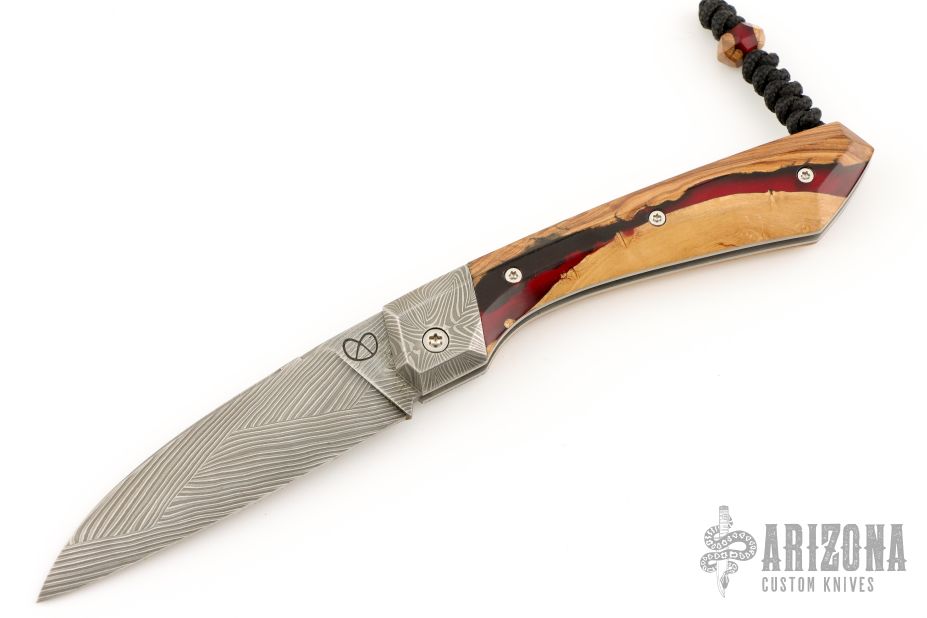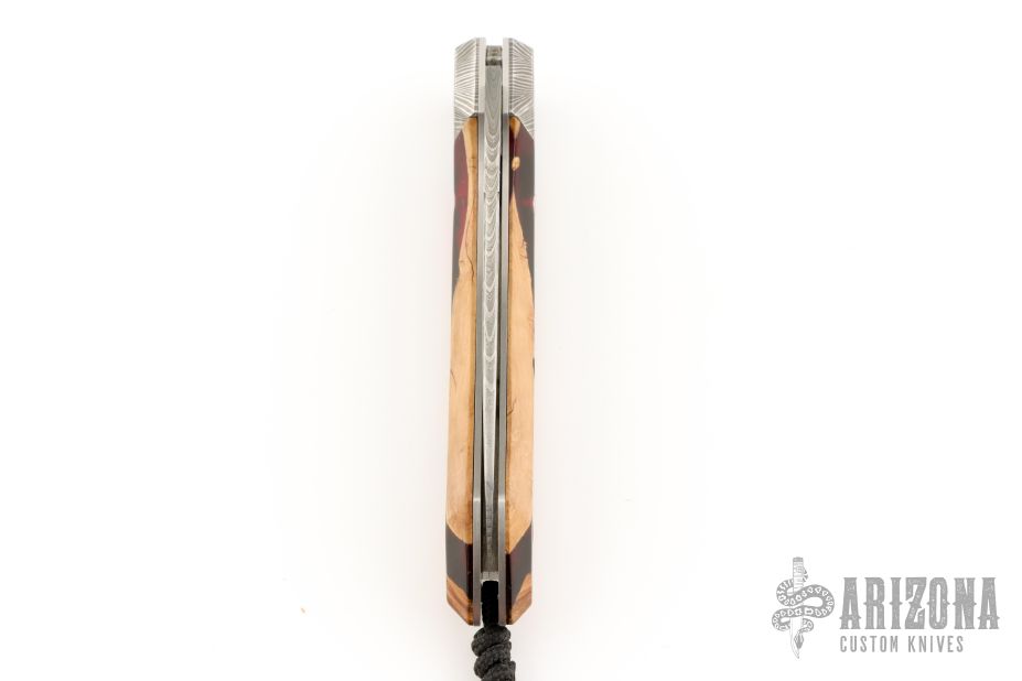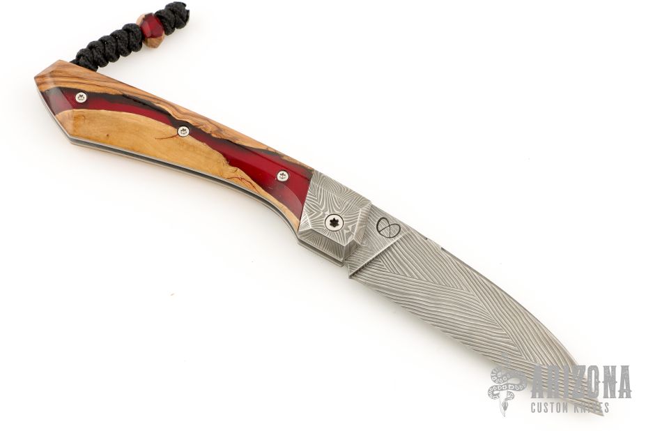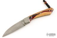 This Slipjoint by Florian Keller features a Damascus blade with fileworked spine. The handle has matching Damascus bolsters, wood covers stabilized with red acrylic, satin steel liners, satin stainless steel spring with filework. Nice blade seating. Has a lanyard with matching wood/acrylic bead. Comes with a brown leather sheath with the Jedi Order'Dark Side Insignia. Excellent condition.