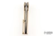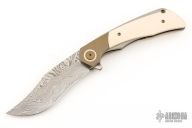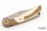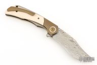 This knife features a Damasteel clip point blade. The handle features anodized titanium bolsters/pocket clip, white paper micarta scales and bead blasted titanium liners. New from maker!