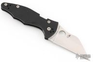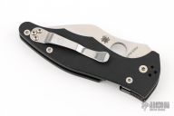 This Yojimbo 2 by Spyderco features a satin finished wharncliffe blade with thumbhole. The handle has a black G-10 frame with stainless steel liners, lock is on the spine of handle. 4-way reversible clip. Nice detent, lockup and blade seating. Has some scuffs and scratches, great condition otherwise.