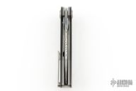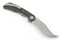 This knife features a Damasteel clip point blade. The handle has black Camo Fatcarbon scales over bead blasted titanium liners with a matching tip up pocket clip. New from maker!