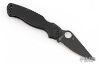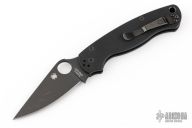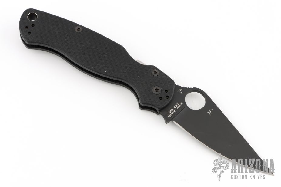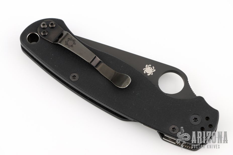 This Paramilitary 2 by Spyderco has a black clip point blade with thumb hole and notched thumb rest. Handle is black G10 with stainless steel liners and black stainless steel 4-way reversible clip. Has some scuffs and scratches, great condition otherwise.