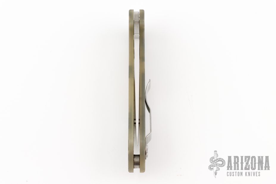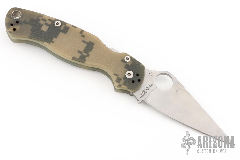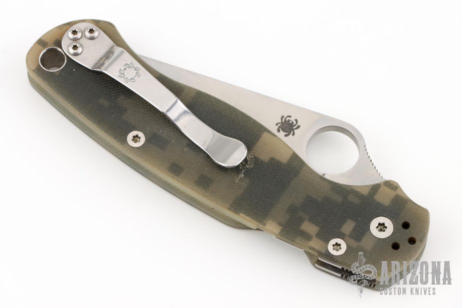 This Paramilitary 2 Linerlock Folder has a satin CPM S30V stainless steel clip point blade with thumb hole and notched thumb rest. Handle is digi camo G10 with stainless steel liners and black stainless steel 4-way reversible clip. Has scuffs and scratches throughout, has been resharpened. Fair condition/good user condition.