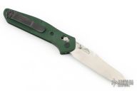 This Benchmade Osborne 940 features a tumble finished clip point blade with swedge and dual thumb studs. The handle is comprised of a machined and green anodized aluminum frame over jimped and purple anodized titanium backspacer. The black coated, steel tip up clip is reversible for right or left hand carry. Comes with a Benchmade black nylon sheath. Excellent condition.
