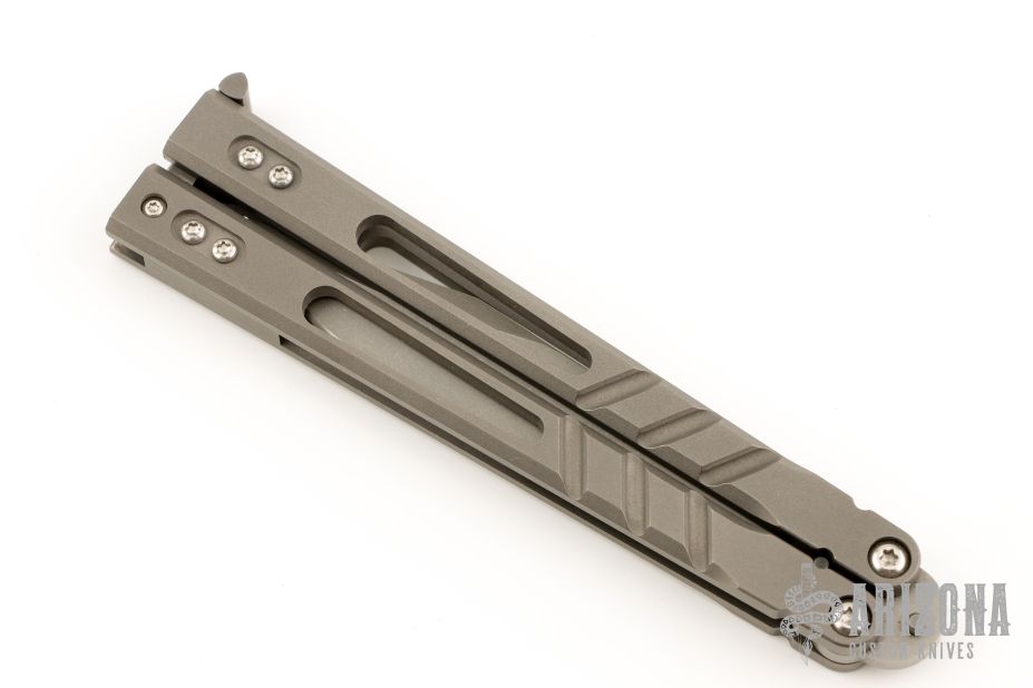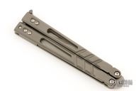 This Alpha Beast Balisong 3.0 from Blade Runner Systems (BRS) features a tumble finished clip point blade. The handle has a milled and tumbled titanium with T latch on pommel. Excellent condition.