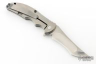 This Transfusion flipper by RJ Martin features polished tumble finish tanto recurve blade with notched thumbrest and flipper. The handle has a bead blast titanium frame with lightning strike carbon fiber inlay, black G-10 backspacer, tip up titanium clip. Fast flipper that requires no wrist action. #04 on the blade. Excellent condition. Comes with a velcro case.