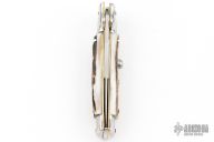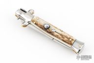 This Picklock Auto from Dolphin D.M. features a bayonet ground blade with false top edge. The handle has stainless steel bolsters and pommel with stag scales, brass liners and steel backspacer. Comes in a Campolin leather sheath. Excellent condition. This one was tuned and polished by Greg's Effects and has a COA.
