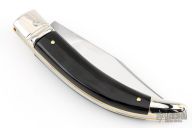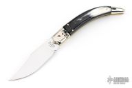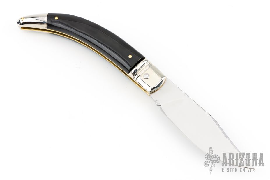 This Diana by AGA Campolin features a mirror polished blade. The handle has mirror polished nickel silver bolsters and lever release, buffalo horn scales, brass liners, stainless steel backspacer. Nice action, nice lockup and blade seating. Includes the original leather envelope sheath. Comes in a Campolin leather button sheath. Excellent condition. Dated 2024 on the ricasso. This one was tuned and polished by Greg's Effects and has a COA.