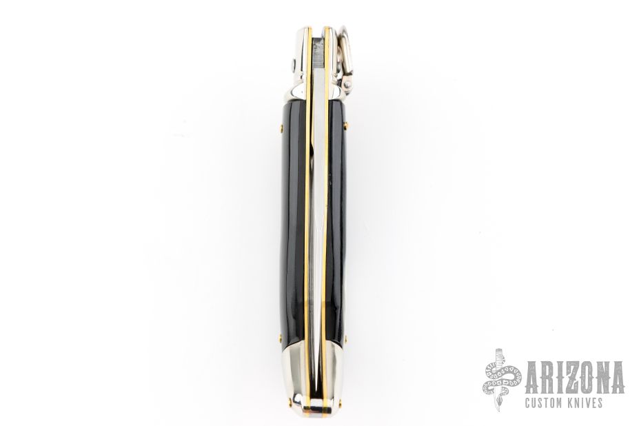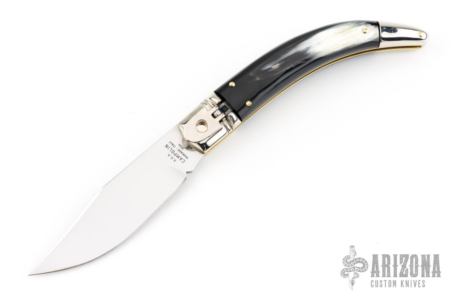 Angelo Campolin Sr. was born in 1923 in Maniago, Italy. He worked on perfecting his knife making skills before WWII and at this time made his first switchblades. After the war, in 1947 he started his company and made 30 stilettos with the marking “Angelo Campolin”. In the 1970’s Angelo’s son Gianni started to work in the company and they were specializing in folding hunting knives and also manual folding stilettos for the Robert Klaas company in Solingen Germany with their Kissing Cranes mark. In 2002 American switchblade collectors Dan Fuller, Brad West, and Tim Zinser were visiting Maniago and enjoying a few glasses of wine in a bar with Angelo Jr. and Gianni. The discussion was about a new name for some knife projects they wanted to pursue. It was Brad West that suggested the tang stamp should be AGA, for Angelo, Gianni, Angelo, thus representing three generations in the knife making business. The Campolins liked it and it stuck. In the beginning it was just a few items, but grew to the point where now there are 12 models and different scale options. The goal has been to offer quality switchblades using the old methods and traditions. Being a collector himself, Angelo Jr. knows what others like. The company headquarters has moved to Austria with production still in the original Maniago shop, as well as the others in Maniago that produce the knives for A.G.A. Campolin.
