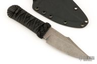 This Hybrid Bowie by Ben Tendick features a tumbled blade with false top edge, .212" blade stock and 1.690" blade depth hidden tang construction. The handle features Tsuka Ito and is complemented with a brass skull and cross bones menuki. Includes a kydex sheath with Mummert Clip. Excellent condition.