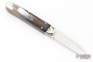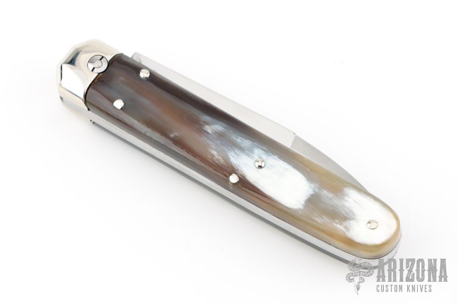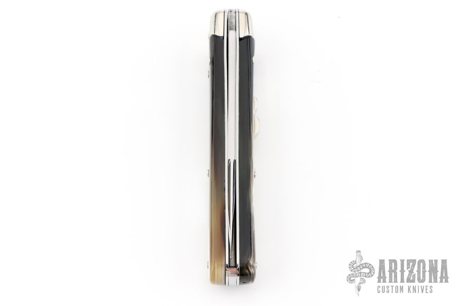 This Baron by AGA Campolin features a mirror finished blade. The handle has nickel silver bolsters, Brazilian horn scales, nickel silver rocker bar, stainless steel liners and backspacer. Comes with Campolin leather button sheath. Excellent condition. This one was tuned and polished by Greg's Effects and has a COA.
