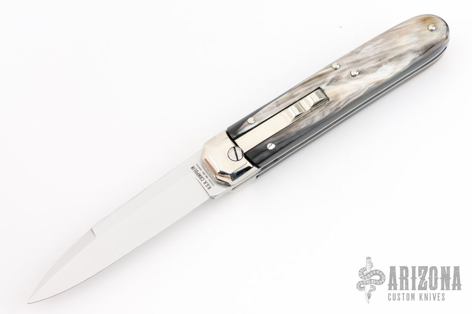 Angelo Campolin Sr. was born in 1923 in Maniago, Italy. He worked on perfecting his knife making skills before WWII and at this time made his first switchblades. After the war, in 1947 he started his company and made 30 stilettos with the marking “Angelo Campolin”. In the 1970’s Angelo’s son Gianni started to work in the company and they were specializing in folding hunting knives and also manual folding stilettos for the Robert Klaas company in Solingen Germany with their Kissing Cranes mark. In 2002 American switchblade collectors Dan Fuller, Brad West, and Tim Zinser were visiting Maniago and enjoying a few glasses of wine in a bar with Angelo Jr. and Gianni. The discussion was about a new name for some knife projects they wanted to pursue. It was Brad West that suggested the tang stamp should be AGA, for Angelo, Gianni, Angelo, thus representing three generations in the knife making business. The Campolins liked it and it stuck. In the beginning it was just a few items, but grew to the point where now there are 12 models and different scale options. The goal has been to offer quality switchblades using the old methods and traditions. Being a collector himself, Angelo Jr. knows what others like. The company headquarters has moved to Austria with production still in the original Maniago shop, as well as the others in Maniago that produce the knives for A.G.A. Campolin.
