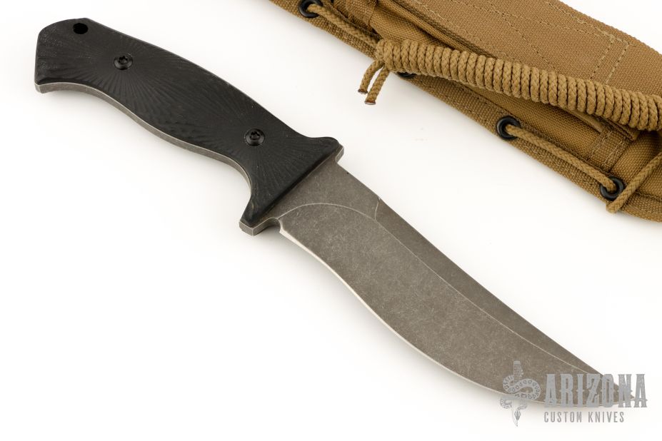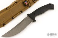 This Hydra Fixed Blade by Les George features a dark stonewashed blade with false top edge, .254" blade stock and 1.495" blade depth, full tang construction. The handle has black G-10 scales and a lanyard hole. Comes with a nylon SpecOps brand sheath. Excellent condition.