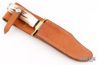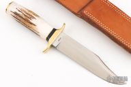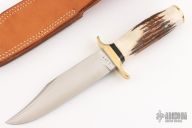 This Model L Bowie by GW Stone features a satin finished clip point blade with a sharpened top edge, .253" blade stock and 1.291" blade depth, hidden tang construction. The handle has a brass guard and butt cap, stag grip with black/brass spacers. Excellent condition. Comes with a brown leather sheath. Purchased from the makers shop in Richardson, TX in 1975.