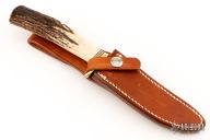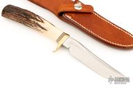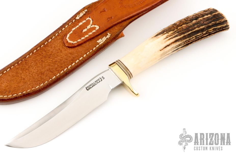 This Model 7-4.5" by Randall Made Knives features a satin finished blade with false top edge, .176" blade stock and .927" blade depth, hidden tang construction. The handle has a brass guard, stag grip and red/white/blue spacers. Knife comes with a Johnson Roughback brown leather sheath and a zippered case. Excellent Condition.