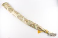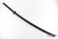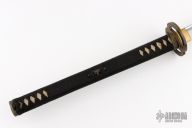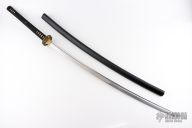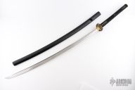 This Katana by Ryan Sword features a folded steel 1095 blade with fullers, .320" blade stock and 1.2228" blade depth, hidden tang construction. The handle has a brass habiki and tsuba, black cord wrap over white stingray skin, brass menuki and fittings. Comes with a black saya and decorative sword bag. Does not have a sheath cord. Has some scratches on the sheath. Excellent condition.