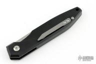 This push button auto features a stonewashed drop point blade. The handle has a black aluminum frame with a bead blasted tip up pocket clip. Includes the original box. Excellent condition. This one was tuned by Greg's Effects and has a COA.
