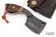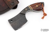 This Ox by Vorn Knives features an acid tumbled cleaver style blade with .263" blade stock and 1.645" blade depth, full tang construction. The handle has carbon fiber bolsters, desert ironwood scales with black liners, white G-10 and green canvas micarta spacers. Comes with a brown leather sheath. Excellent condition.