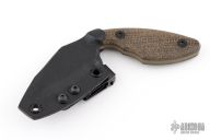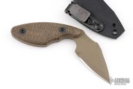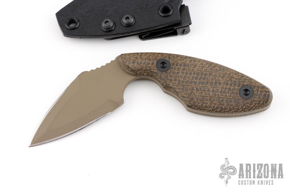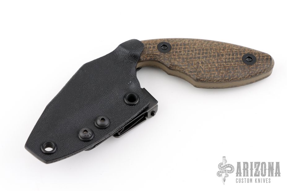 This Punch Dagger by Half Face Blades features a green double-edged with a full tang construction and notched thumbrest, .154" blade stock and 1.268" blade depth.  The handle has burlap micarta scales.  Includes a kydex sheath with Ulti-clip.  Has a few light scuffs, otherwise excellent condition.