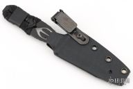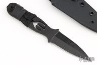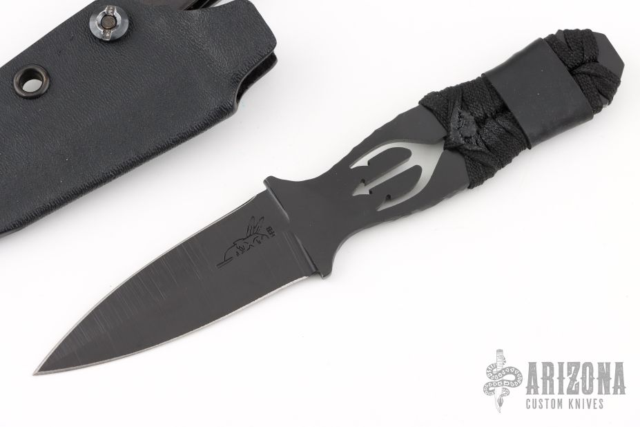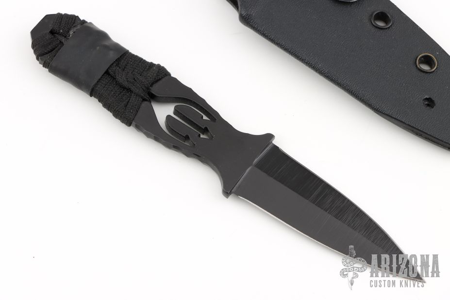 This Trident Dagger by Half Face Blades features a black double-edged blade with a full tang construction, .154" blade stock and .995" blade depth. The handle has black cord and rubber wrap. Includes a kydex sheath with Ulti-clip. Excellent Condition.