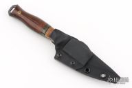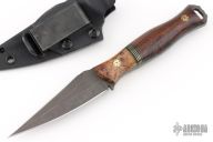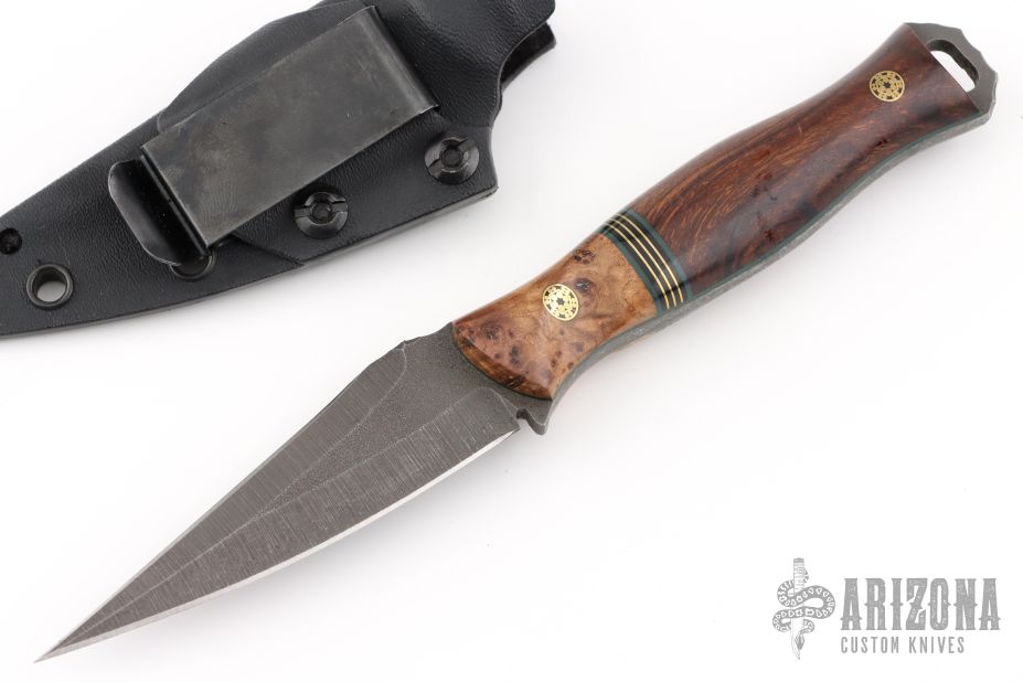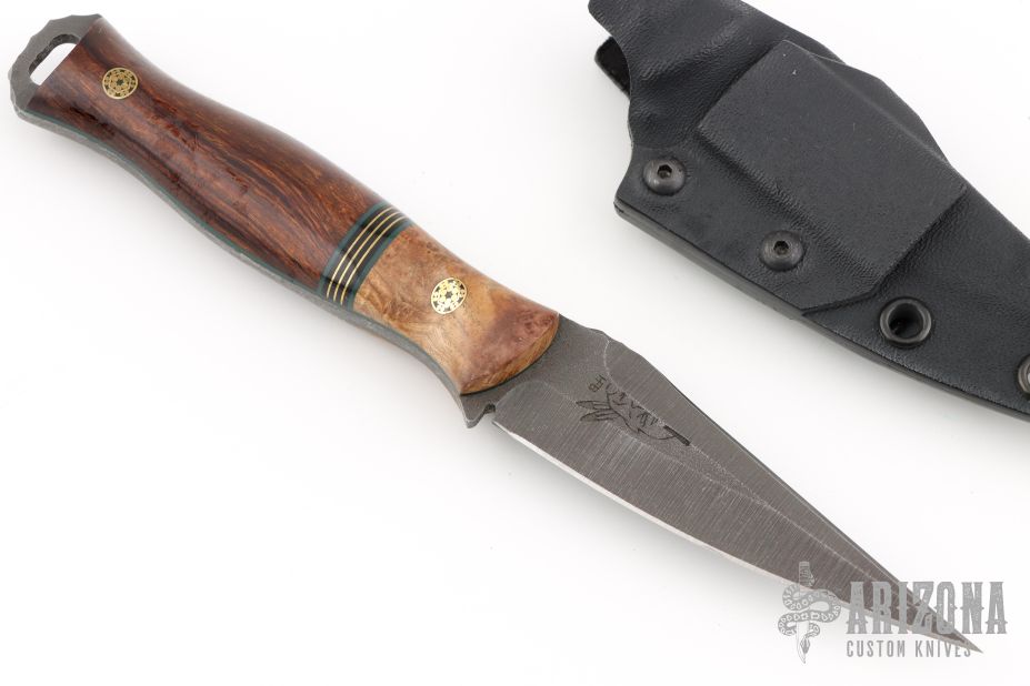 This Custom Enforcer by Half Face Blades features a dark stonewashed blade with a fileworked spine and sharpened top edge, .155" blade stock, 1.027" blade depth, full tang construction. The handle has burl wood bolsters, desert ironwood scales with black liners, mosaic pins, lanyard hole at the butt. Comes with a kydex sheath with clip. Excellent condition.