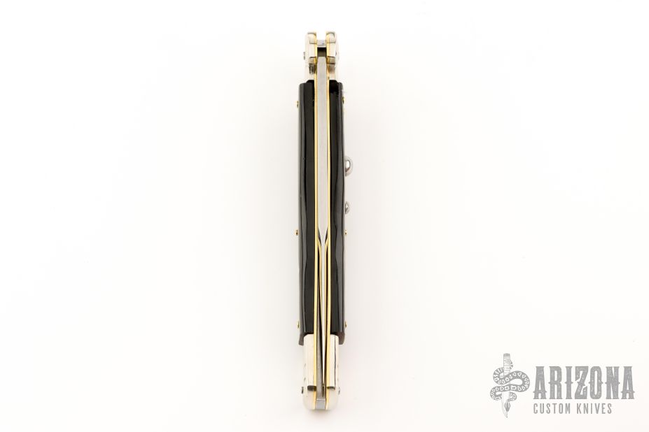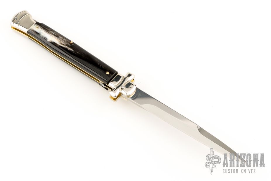This lockback Auto by AGA Campolin has a mirror polished stainless steel spear point blade with false top edge. The handle has buffalo horn scales with mirror polished nickel silver bolsters, brass liners, stainless steel backspacer. Comes with a leather sheath and deluxe box. Excellent condition. This one was tuned and polished by Greg's Effects and has a COA.