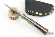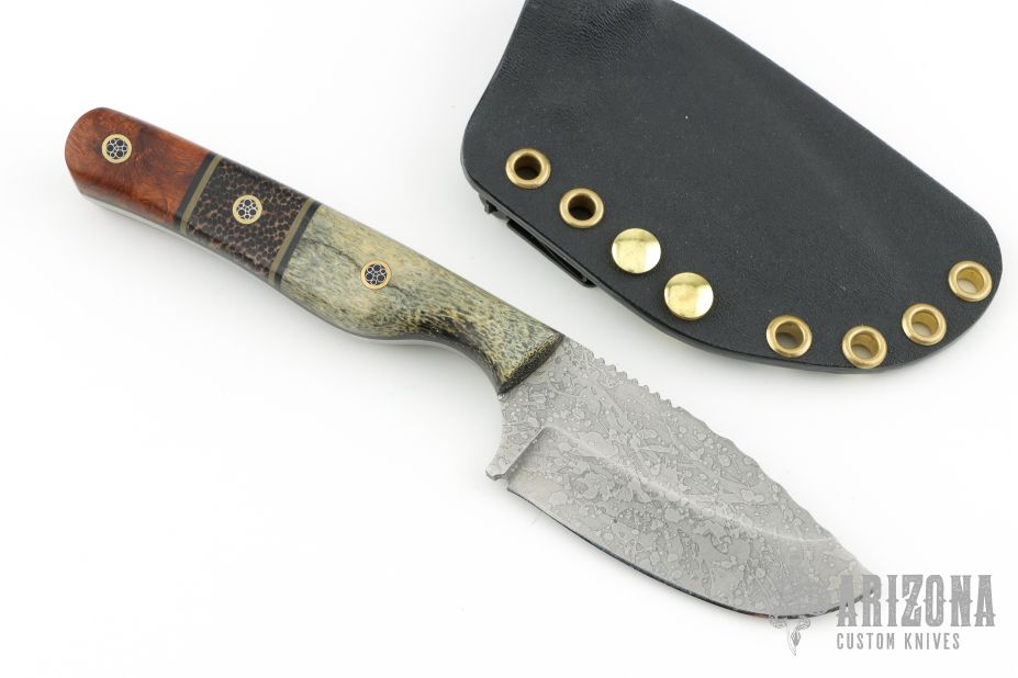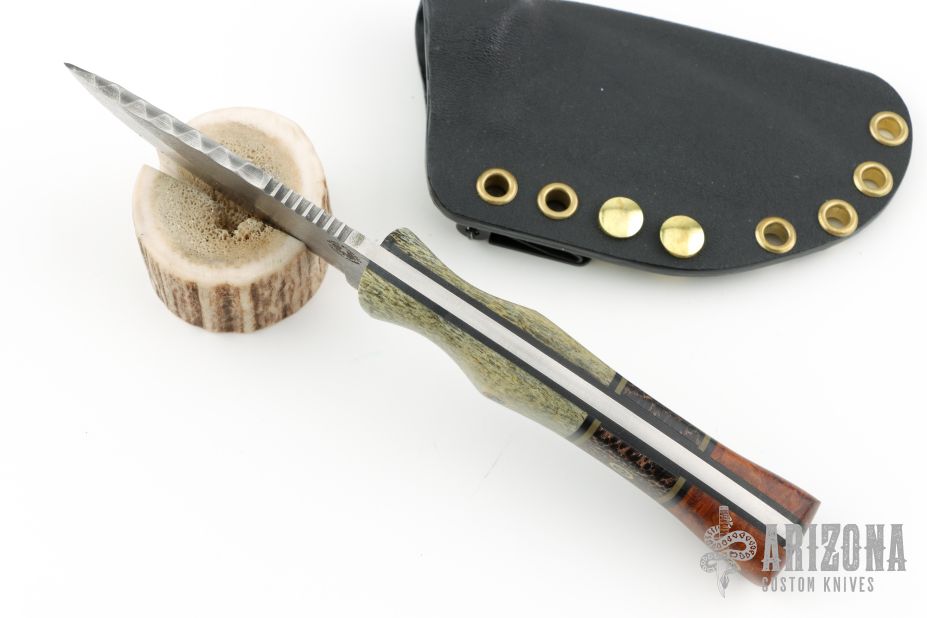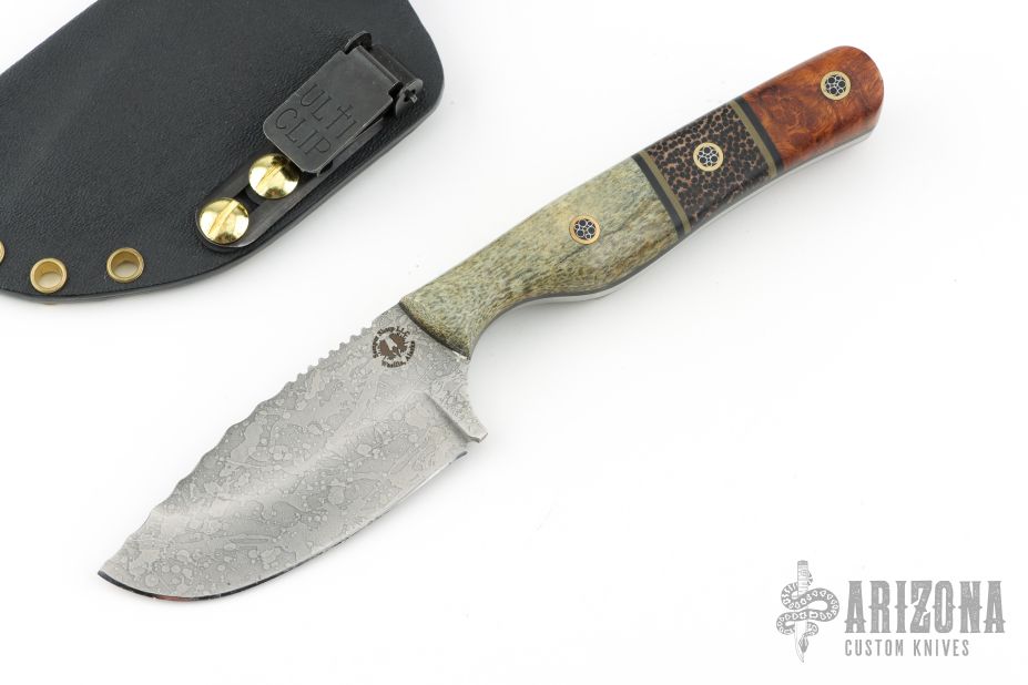 This Lynx by Semper Sharp LLC features an acid etched blade with fileworked spine and notched thumbrest, .164" blade stock and 1.366" blade depth, full tang construction. The handle has multi-piece scales with stabilized moose antler, black palm wood and desert ironwood burl, has black and green G-10 spacers and mosaic pins. Comes with a kydex sheath with an Ulti-Clip. Excellent condition.