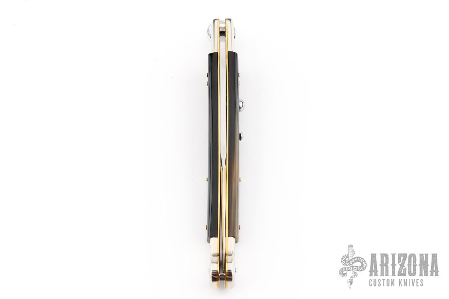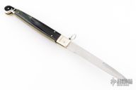 This 12" Sicilian Fighting Knife Ringpull Auto by AGA Campolin features a spear point blade. The handle has nickel silver bolsters, buffalo horn scales, brass liners and stainless steel backspacer. Has a ring pull. Comes with original deluxe wood box, papers, and leather sheath. Excellent condition. This one was tuned and polished by Greg's Effects and has a COA.