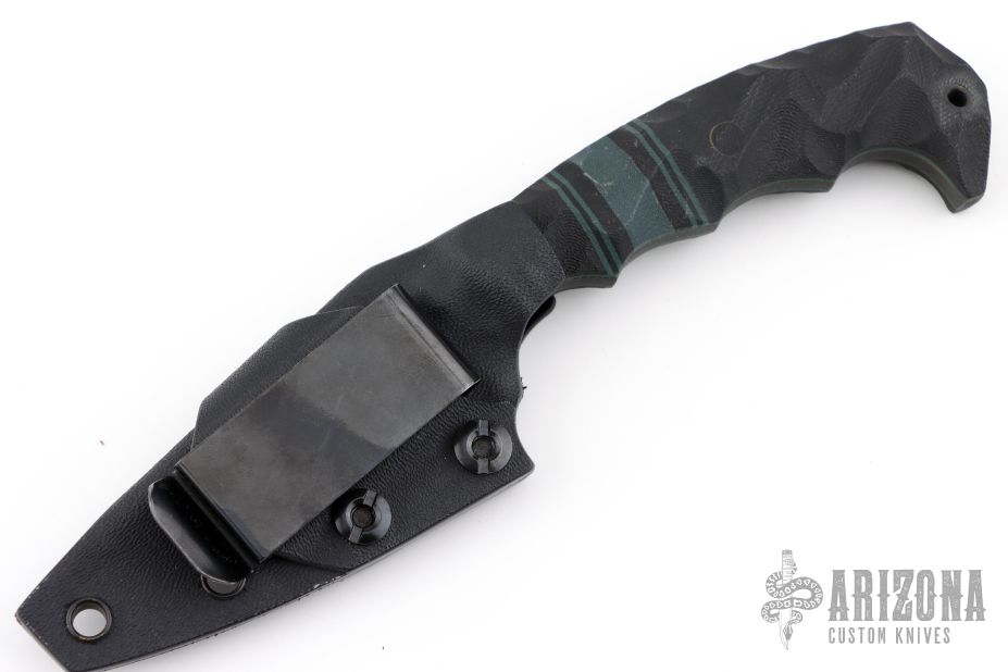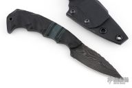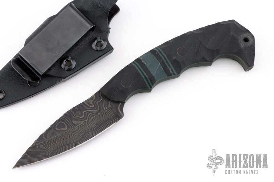 This Humint by Half Face Blades features a Damascus blade with fileworked spine, .136" blade stock and .896" blade depth, full tang construction. The handle has black G-10 scales with green G-10 spacers and liners. Comes with a suede lined kydex sheath. Excellent condition.