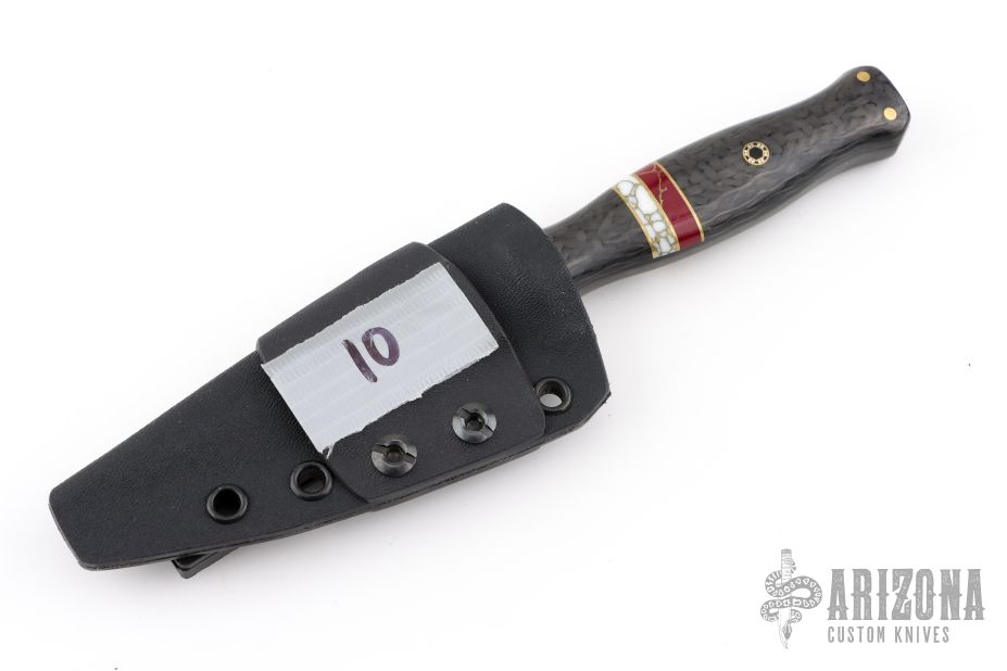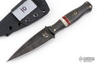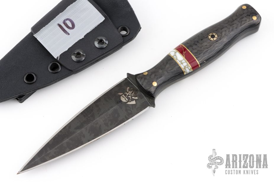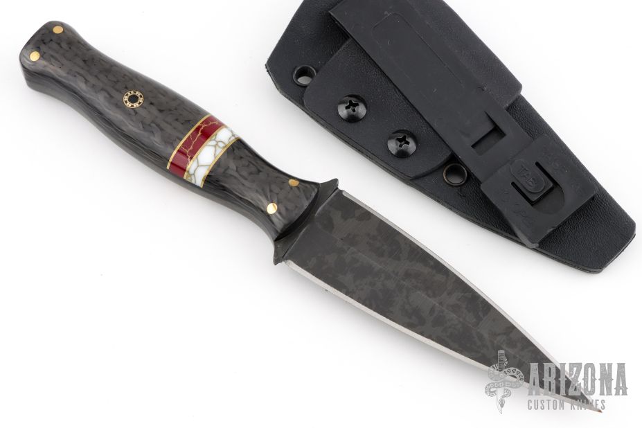This Dagger by Sea Sick Blades features a double-edged blade with full tang construction.  .165" Blade Stock.  1.216" Blade Depth. The handle has a carbon fiber scales with brass and stone spacers, brass and mosaic pins. Comes with a kydex sheath. Excellent Condition.
