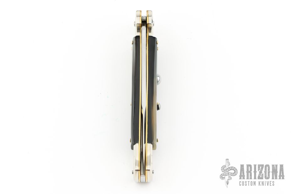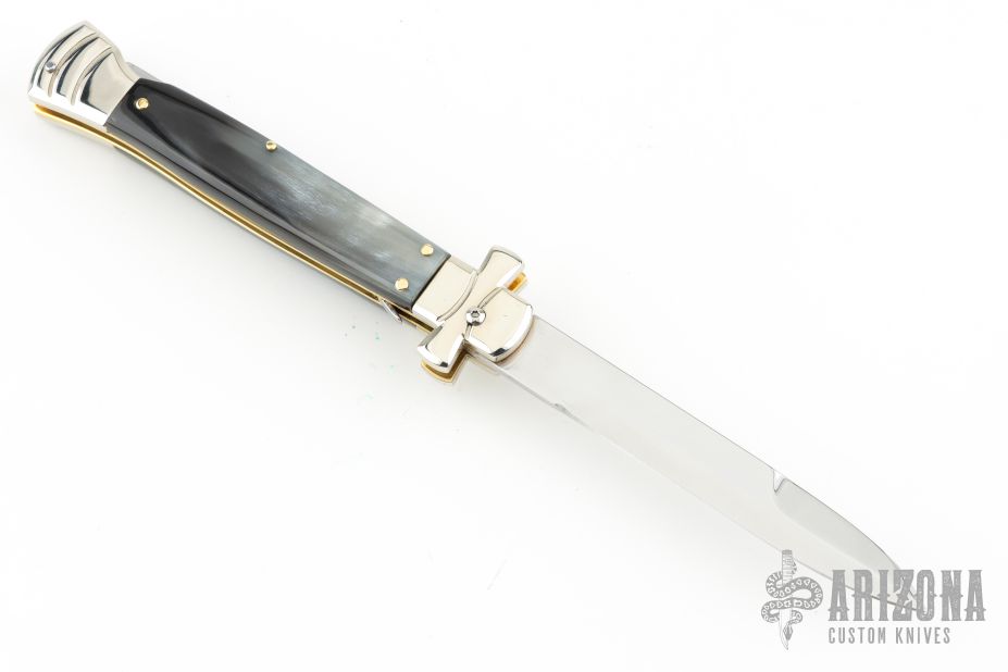 This lockback Auto by AGA Campolin has a stainless steel spear point blade with false top edge. Handle is buffalo horn with nickel silver bolsters, brass liners, stainless steel backspacer. Comes with a leather slip sheath. Excellent condition. This one was tuned and polished by Greg's Effects and has a COA.
