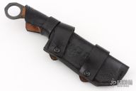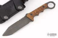 This Mannfall by Vorn Knives features an acid etched blade with notched thumbrest and sharpened top edge, .179" blade stock and 1.335" blade depth, full tang construction. The handle has textured ironwood scales and black G-10 liners. Comes with a brown leather sheath. .910" finger hole. Excellent condition. Comes with original box and COA