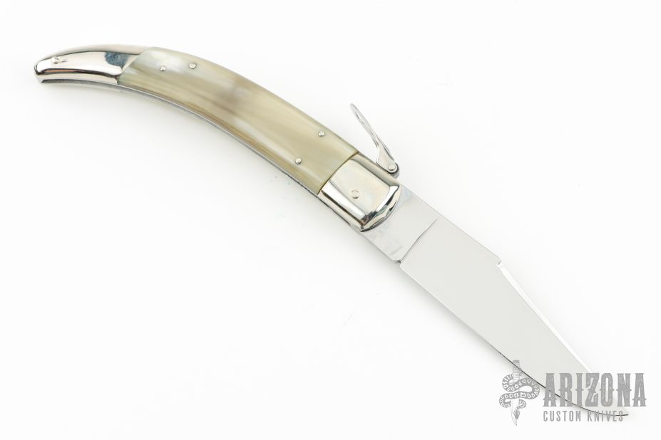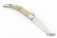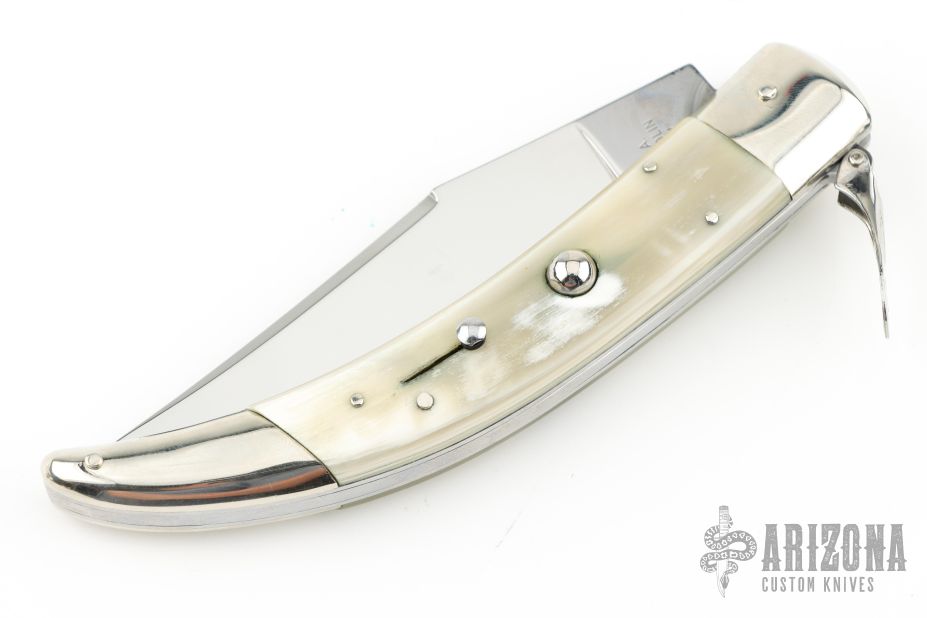 This Diana Auto by AGA Campolin features a mirror finished blade, blonde horn scales, brass liners and nickel silver bolsters. Has safety. Comes in a soft pouch. The safety does not work everytime, otherwise excellent condition. This one was tuned and polished by Greg's Effects and has a COA.