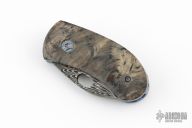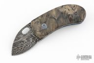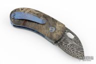 This Linerlock by Alan Davis features a Feather Damascus blade with thumbhole. The handle has burl wood scales with black liners, textured and anodized titanium liners with jeweled interiors and fileworked spines, and a fileworked and anodized titanium backspacer and tip up clip. Nice detent, lockup and blade seating. Excellent condition.