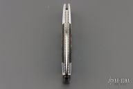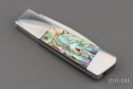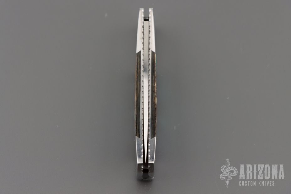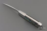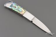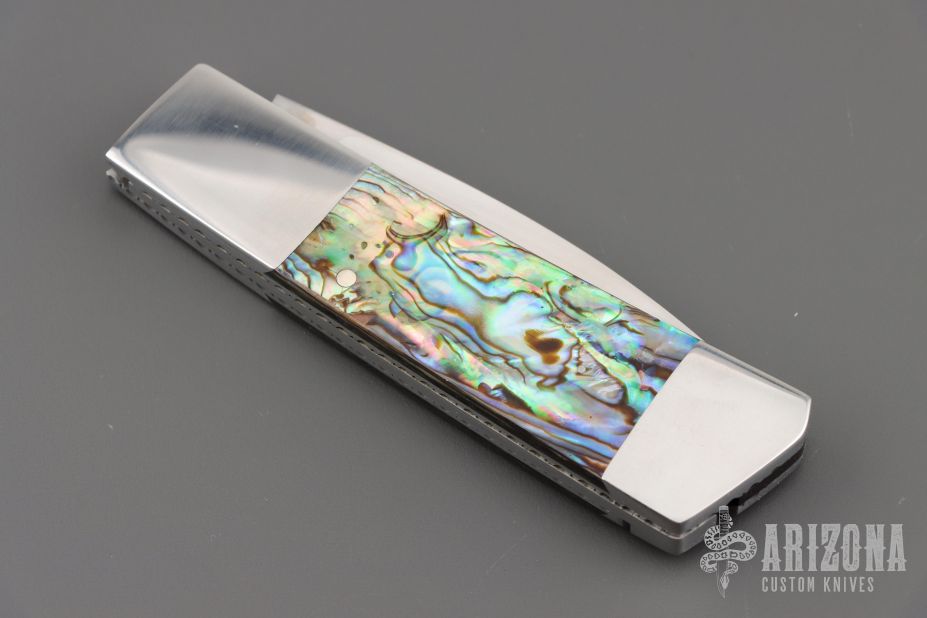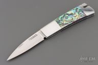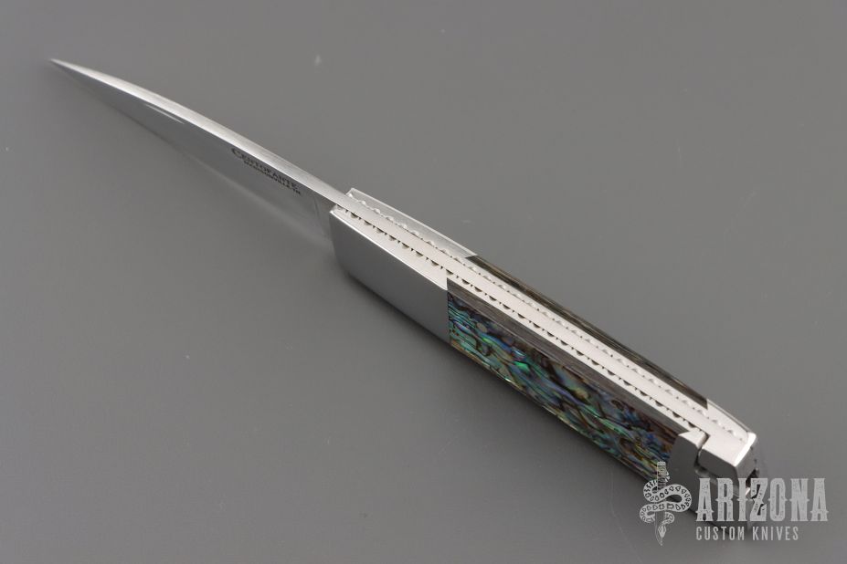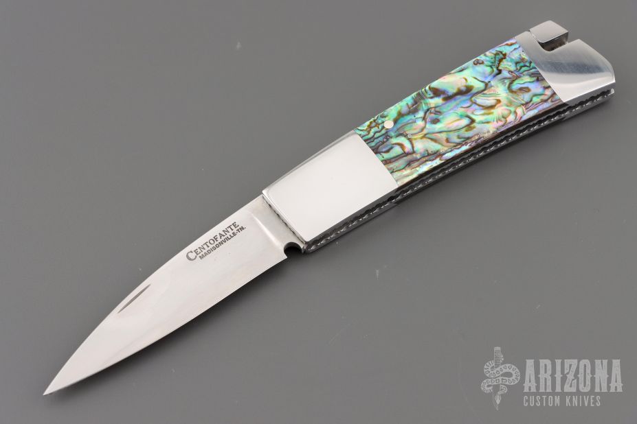 This Side lock by Frank Centofante features a hand rub satin finished blade with nail nick. The handle has dovetailed stainless steel boslters, abalone scales, fileworked stainless steel liners and a stainless steel backspacer. Nice lockup and blade seating. Comes with in a zipper case. Has some light scratches, excellent condition otherwise.