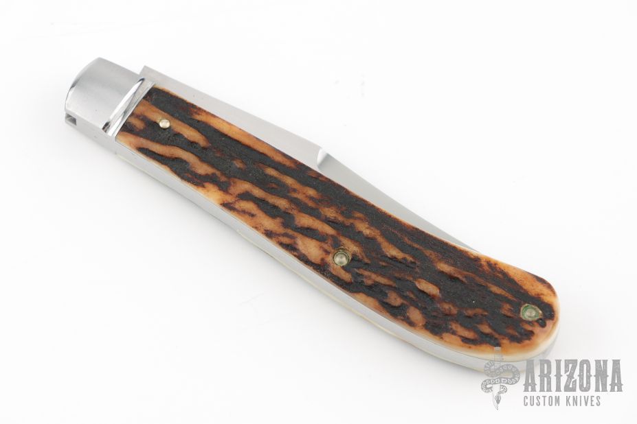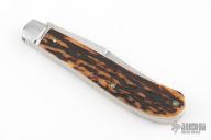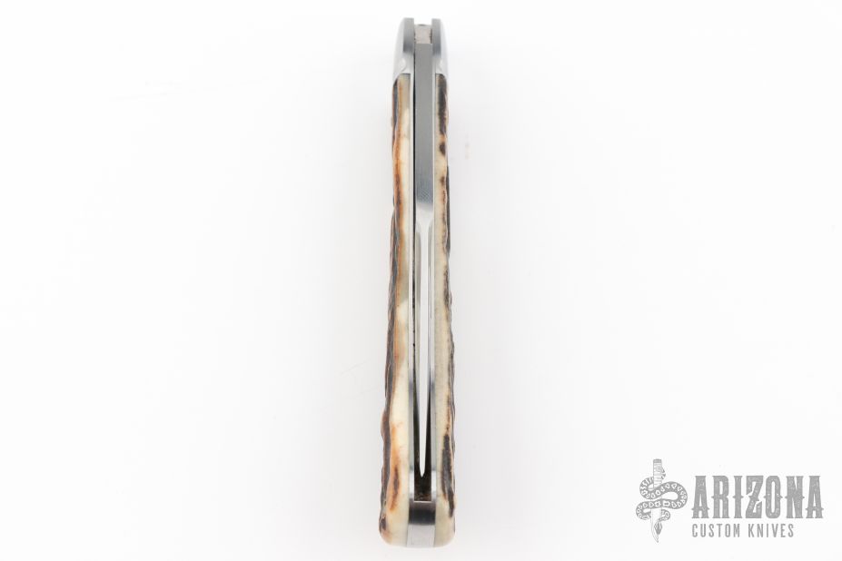 This slipjoint by Mike Zscherny features a clip point blade with a hand rubbed satin finish and nail nick. The handle has a fluted stainless steel bolsters, stag covers, stainless steel liners and spring. Half stop on blade, flush in all positions. Has a few light scratches, otherwise excellent condition.