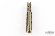 This Linerlock by Alan Davis features a Damascus blade with a single thumbstud made of silver and copper.  The handle has magma textured and anodized titanium bolsters, stag scales, fileworked and anodized titanium liners with jeweled interiors, anodized and fileworked titanium backspacer. Nice detent, lockup and blade seating. Excellent condition.