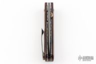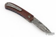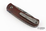 This Linerlock by Alan Davis features a Damascus blade with a single thumbstud. The handle has desert ironwood burl wood scales with black liners, textured and anodized titanium liners with jeweled interiors, desert ironwood burl backspacer, Damascus tip up clip. Nice detent, lockup and blade seating. Excellent condition.