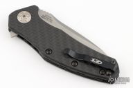 This 0770CF Linerlock Flipper (#28064) has a stonewashed drop point blade with notched thumb rest. Handle is carbon fiber with stainless steel single liner (lock), and black stainless steel tip up clip (RH/ LH reversible). Nice action, lockup and blade seating. Comes with original box and papers. Has a couple light scuffs, otherwise Excellent condition.