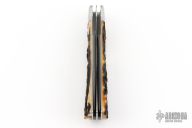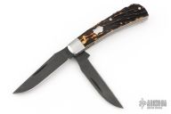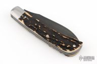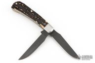 This Modified Trapper by Matt Collum is one of his own patterns. It features acid etched blades with nail nicks. The handle has stainless steel bolsters, stag covers with a stainless steel shield esctucheon, stainless steel liners and springs. Has half-stop, flush in all positions. Comes with a zippered case. Excellent condition. These are as nicely done and as clean as any!