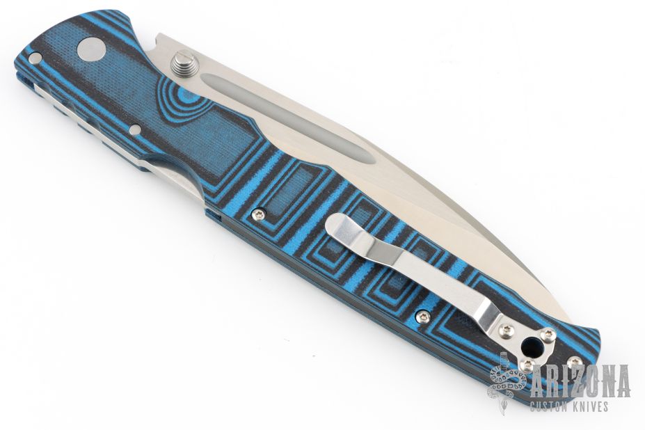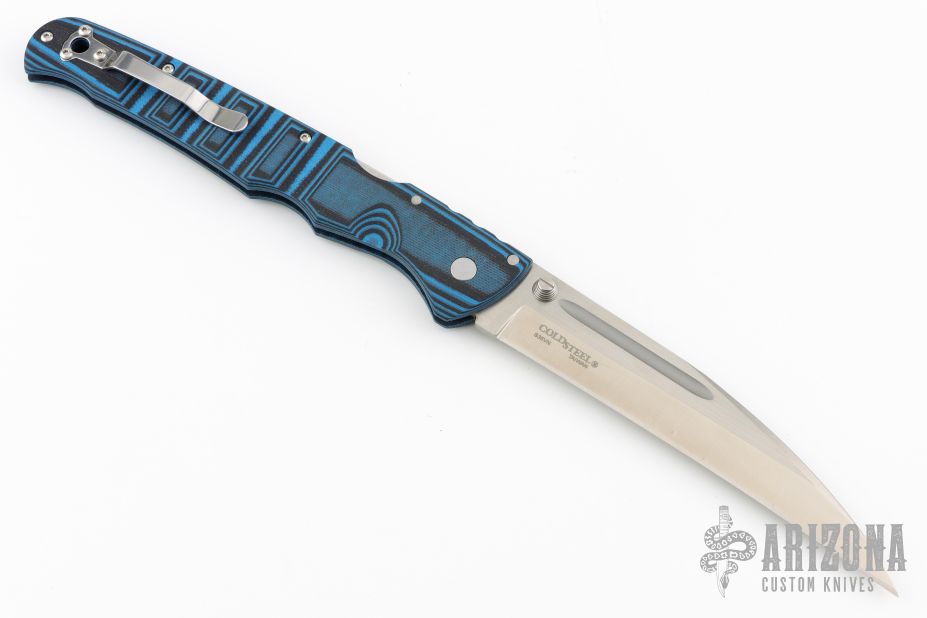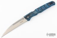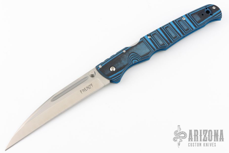 This Frenzy by Cold Steel features a satin finished blade with fullers and dual thumbstuds. The handle has black/blue G-10 scales with stainless steel and black backspacer. Tip up reversible stainless steel clip. Comes with original box. Excellent condition.