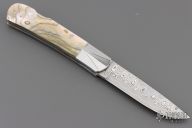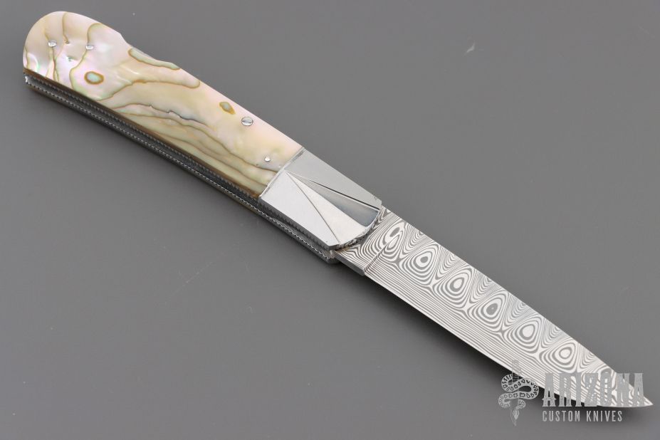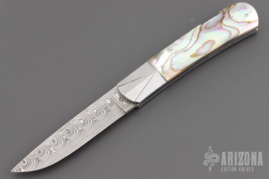 This Lockback by Ken Steigerwalt features a Damasteel blade with nail nick. The handle has two-tone carved stainless steel bolsters, abalone scales, fileworked stainless steel liners and backspacer. Has some light scratches and a couple of small dings in the bolsters, otherwise good condition. Comes with a zippered case.
