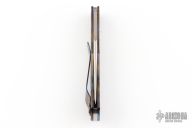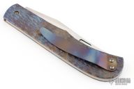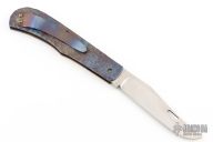 This Trapper by Mike Zscherny features a satin finished blade with a thumbhole. The handle features jigged and anodized titanium covers, stainless steel spring, tip up anodized titanium clip. Has half-stop, flush in all positions. Comes with zippered case. Excellent condition.