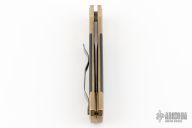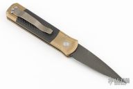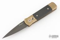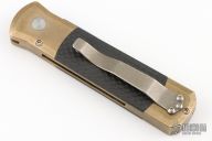 This Godson from Pro-Tech Knives features a Vegas Forge Herringbone Damascus blade with swedge. The handle has a stonewashed al/bronze frame with a carbon fiber button, tip up clip.  Carbon fiber scales. Comes with original box, papers, wood box and pouch. Has patina, excellent condition otherwise.