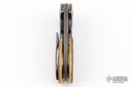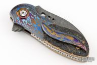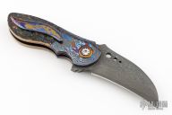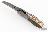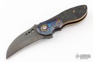 This Linerlock flipper by Alistair Bastian features a Vegas Forge Stainless San Mai Damascus blade with fileworked thumbrest and flipper. The handle has Bastanium bolsters with anodized titanium pivot collars and custom pivot, bark mammoth ivory scales, anodized titanium liners, Kalidescope fileworked 2-piece stainless steel backspacer, Bastanium tip up clip with hidden screws. Nice blade seating, detent and lock up, rides on caged bearings. Excellent condition. #299 inside backspacer. Comes with a zippered case.