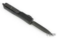 This Makora OTF automatic by Microtech features a black double edge blade. The handle has a black aluminum frame with nonslip inlays. Black stainless steel clip, tip down carry. Dated 03/2022 and 401 on clip. Comes with the original box. Excellent Condition.