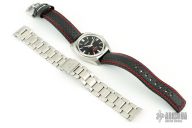 Comes fitted with a black leather band. Comes with original box, outer box, papers, receipt, manual, and stainless steel band. Has a couple really light scratches on the case, otherwise excellent condition.