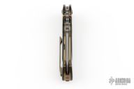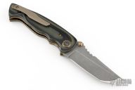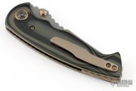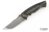 This linerlock by Randy Doucette features an tacit tumble finished blade with false top edge, notched thumbrest and dual thumbstuds. The handle has black/green/tan G-10 scales, anodized titanium pivot collars, anodized titanium liners with jeweled interiors, anodized titanium backspacer and tip up clip. Nice lockup, detent, and blade seating. Includes a padded zippered case. Excellent condition.