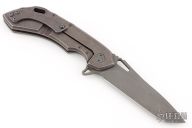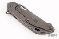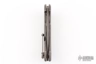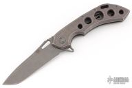 This Wayfarer 247T from Olamic Cutlery features an acid/tumble finish tanto blade with swedge, thumb hole, notched thumb rest and flipper. The titanium handle is also acid/tumble finished with a matching pocket clip is positioned for tip up carry with a ceramic ball inlay, floating anodized titanium backspacer. The Wayfarer 247 is very comfortable in the hand and flips well with no wrist action needed. Blade is centered when closed and locks up with no play. Serial number of T157T. Excellent condition.