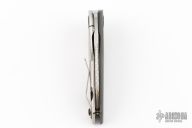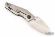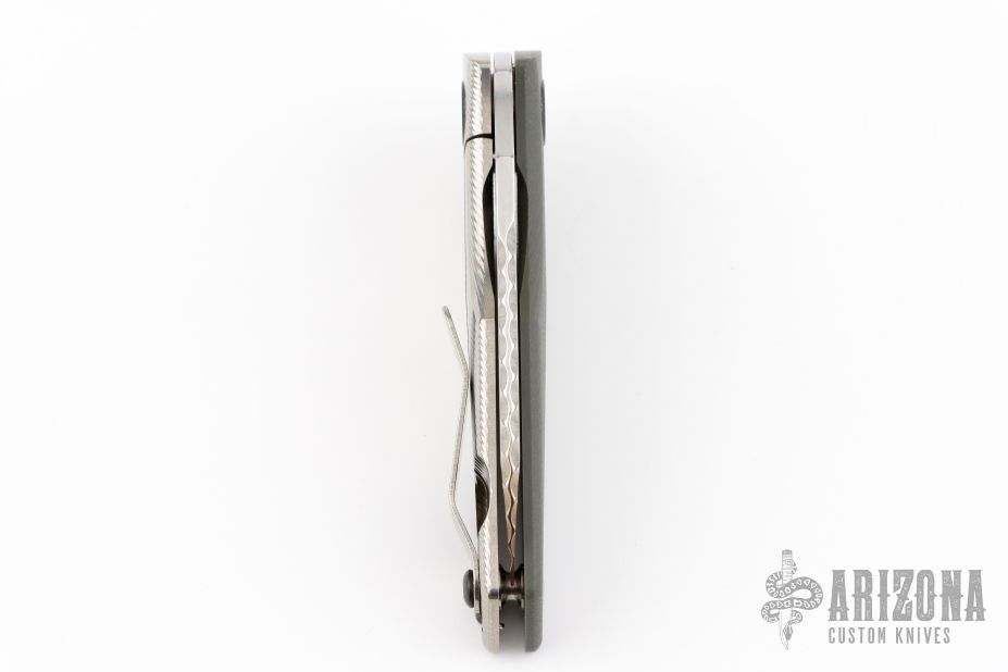 This SJ75 Baby Huey framelock folder by Strider Knives has a hand ground satin/tumble finished blade and a green G-10 and tumbled titanium frame with tip up titanium clip. File work on blade spine and inner edges of frame along the spine.  Nice detent, lockup and blade seating. Excellent Condition.