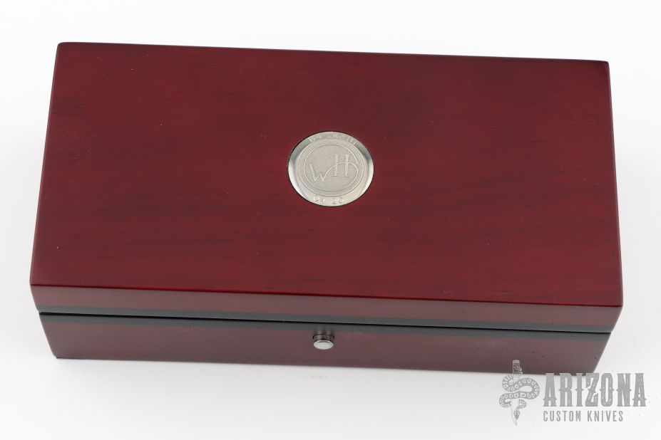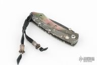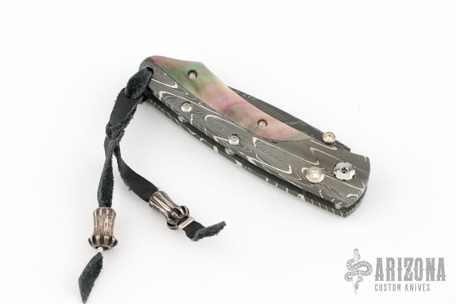 This B04 Tahiti by William Henry features Mike Norris "Ribbon Lace" Damascus blade and single thumb stud with diamond inset. The handle is comprised of a Larry Donnelly carbon Damascus frame with Black Lip Pearl overlays over stainless barrel spacers. Diamond inset on button lock and lanyard hole with leather lanyard in pommel. Includes leather sheath with pocket clip and original box and paperwork. Excellent condition. 74-0267 04/20 12/3/2007
